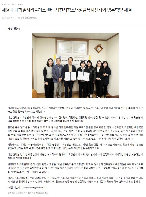 [ÃæÃ»Å¸ÀÓÁî] ¼¼¸í´ë ´ëÇÐÀÏÀÚ¸®Ç÷¯½º¼¾ÅÍ, Á¦Ãµ½Ãû¼Ò³â»ó´ãº¹Áö¼¾ÅÍ¿Í ¾÷¹«Çù¾à ü°á