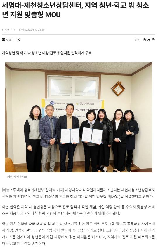 [ÀÌ´º½ºÅõµ¥ÀÌ] ¼¼¸í´ë-Á¦ÃµÃ»¼Ò³â»ó´ã¼¾ÅÍ, Áö¿ª û³â¡¤Çб³ ¹Û û¼Ò³â Áö¿ø ¸ÂÃãÇü MOU