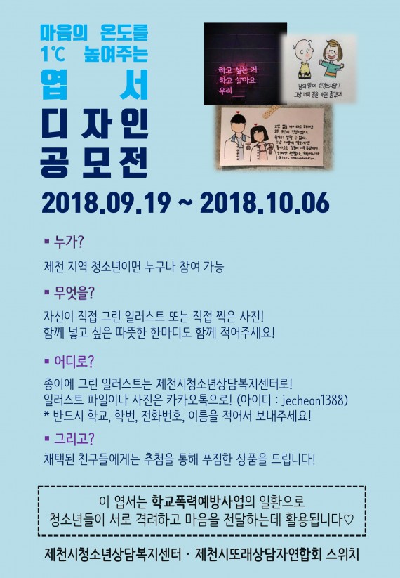 마음의 온도를 1℃ 높여주는 엽서 디자인 공모전 페이지 정보 작성자 운영자 댓글 0건 조회 6,434회 작성일 18-09-28 09:30 본문 마음의 온도를 1℃ 높여주는 엽서 디자인 공모전 목록 이전글[채용공고] 제천시학교밖청소년지원센터 직원 공개채용 18.10.05 다음글2019년 대비 검정고시 준비를 함께할 청소년을 모집합니다. 18.09.10 댓글목록 댓글목록 등록된 댓글이 없습니다.