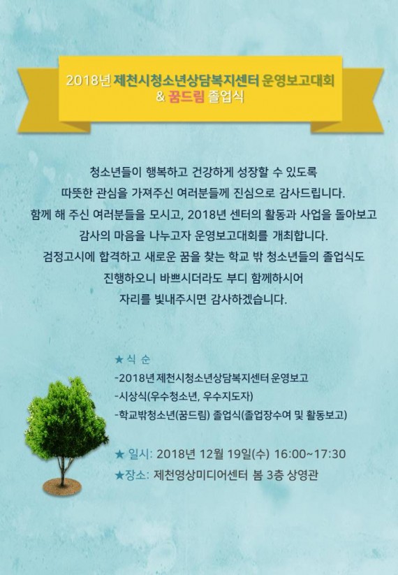[안내]2018년 제천시청소년상담복지센터 운영보고대회&꿈드림 졸업식 페이지 정보 작성자 운영자 댓글 0건 조회 5,841회 작성일 18-12-06 18:21 본문 2018년 제천시청소년상담복지센터 운영보고대회&꿈드림 졸업식 목록 이전글[채용공고] 제천시청소년상담복지센터 청소년동반자 공개채용 공고 18.12.11 다음글2018년 학교폭력예방을 위한 청소년한마당 18.11.08 댓글목록 댓글목록 등록된 댓글이 없습니다.