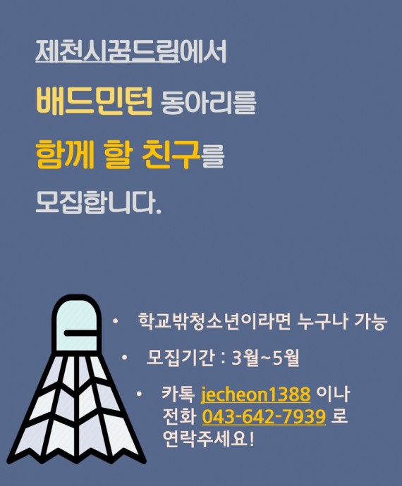 배드민턴 동아리를 함께 할 친구를 모집합니다! 페이지 정보 작성자 운영자 댓글 0건 조회 5,727회 작성일 19-03-13 09:19 본문 . 목록 이전글대학생 서포터즈 모집 19.03.20 다음글2019겨울방학 청소년 집단상담 프로그램 안내 19.02.01 댓글목록 댓글목록 등록된 댓글이 없습니다.