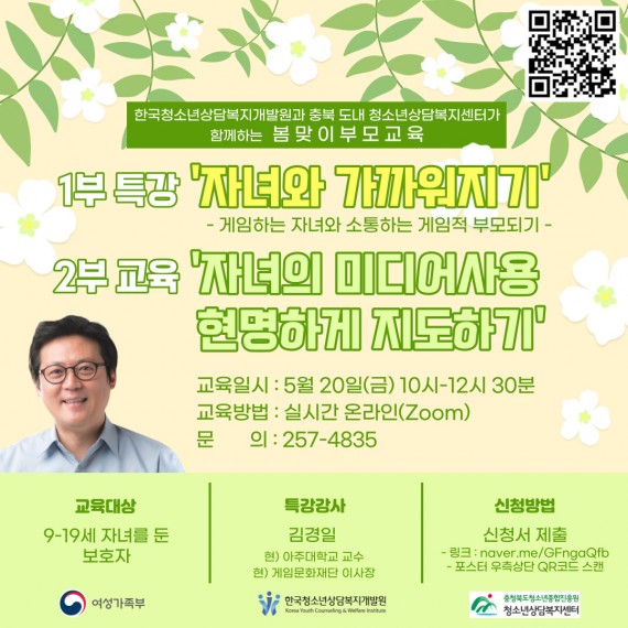 2022년 청소년 인터넷 중독 예방 학부모 특강 안내(5/20 금) 페이지 정보 작성자 운영자 댓글 0건 조회 5,334회 작성일 22-04-29 14:44 본문 안녕하세요 :) 한국청소년상담복지개발원과 충북 도내 청소년상담복지센터가 함께하는 봄맞이 부모교육을 진행합니다 ! 많은 참여 부탁드립니다 :D 온라인 신청 > naver.me/GFngaQfb < 관련링크 http://naver.me/GFngaQfb 2810회 연결 목록 이전글[채용공고]제천시청소년상담복지센터 청소년동반자(시간제) 공개채용 공고 22.05.04 다음글2022 시민카운슬러대학 수강생 모집 22.04.07 댓글목록 댓글목록 등록된 댓글이 없습니다.
