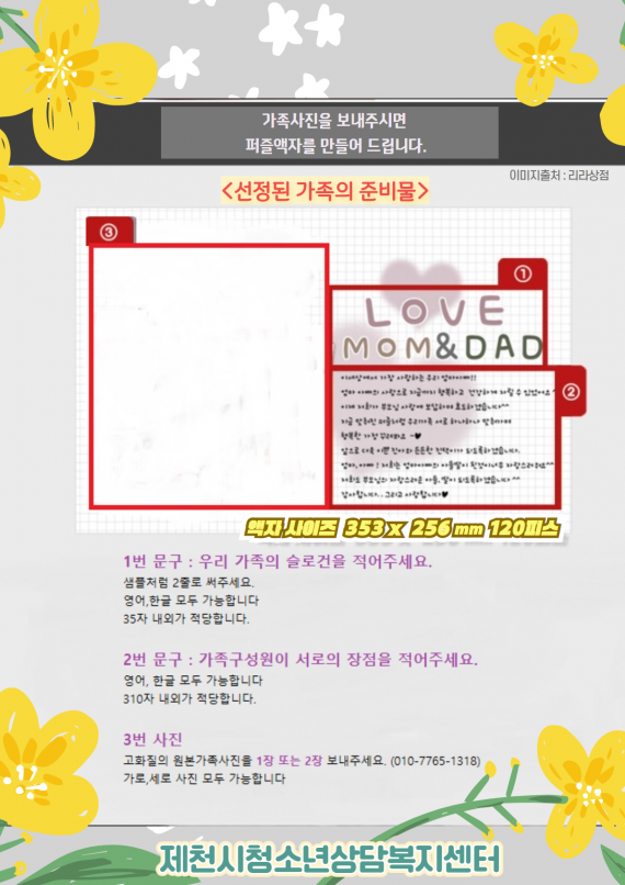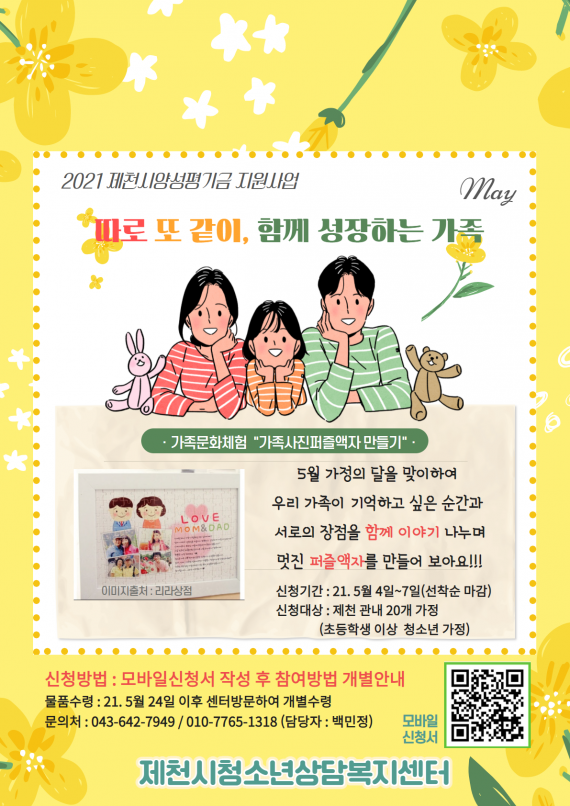 [따로 또 같이, 함께 성장하는 가족] 가족사진퍼즐액자 만들기 페이지 정보 작성자 운영자 댓글 0건 조회 6,115회 작성일 21-05-04 10:37 본문 [따로 또 같이, 함께 성장하는 가족] 가족사진퍼즐액자 만들기를 진행합니다. 많은 참여 부탁드립니다. 신청서 https://forms.gle/pTVtFUT4DTfebifS6 목록 이전글2021년 마음의 온도를 1℃ 높이는 엽서 디자인 공모전 진행 21.05.11 다음글2021 시민카운슬러대학 수강생 모집 21.04.30 댓글목록 댓글목록 등록된 댓글이 없습니다.