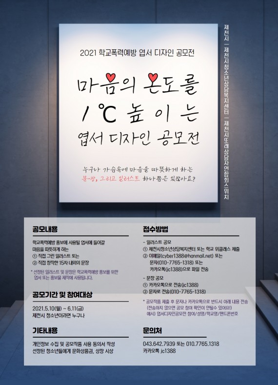 2021년 마음의 온도를 1℃ 높이는 엽서 디자인 공모전 진행 페이지 정보 작성자 운영자 댓글 0건 조회 6,331회 작성일 21-05-11 10:50 본문 관심있는 청소년들의 많은 참여 바랍니다 :D 목록 이전글2021년 검정고시 준비반 개강 안내 21.05.18 다음글[따로 또 같이, 함께 성장하는 가족] 가족사진퍼즐액자 만들기 21.05.04 댓글목록 댓글목록 등록된 댓글이 없습니다.