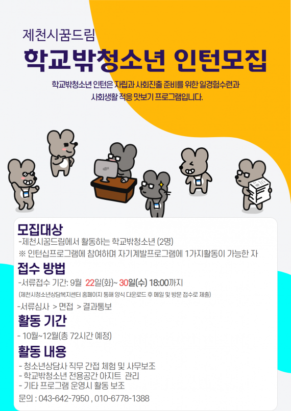 학교밖청소년 인턴을 모집하고 있습니다. 관심있는 학교밖청소년들은 신청해주시기 바랍니다.