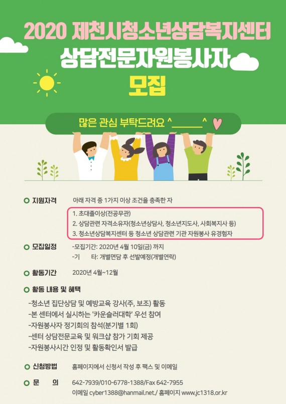 제천시청소년상담복지센터에서는 상담전문자원봉사자를 모집합니다^^