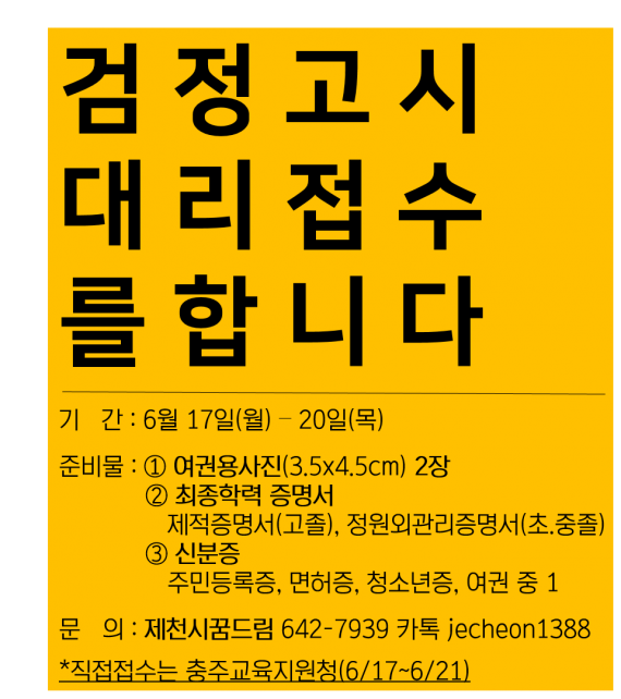 2019년 8월 7일 수요일에 치뤄지는 검정고시 대리접수를 하오니 많은 관심부탁드립니다.