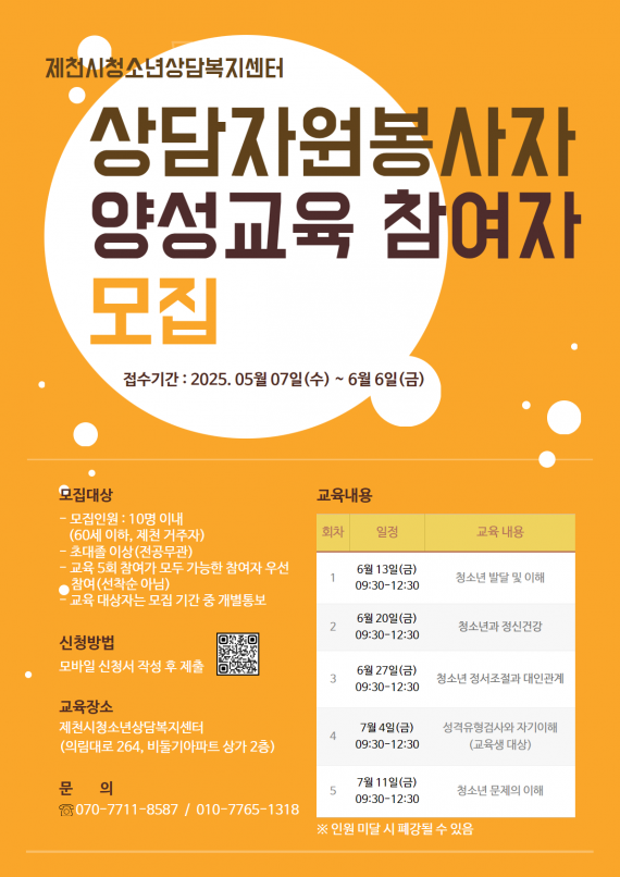 2025년 상담자원봉사자 양성교육 참여자 모집 페이지 정보 작성자 운영자 댓글 0건 조회 3,016회 작성일 25-05-07 15:53 본문 ▼모바일 신청서▼ https://forms.gle/SXcvKnGmN5L1aec86 관련링크 https://forms.gle/SXcvKnGmN5L1aec86 1505회 연결 목록 이전글또래상담 프로그램 '너의 고민이 보여' 신청서 25.07.11 다음글2025 청소년 힐링캠프 참가안내 25.05.02 댓글목록 댓글목록 등록된 댓글이 없습니다.