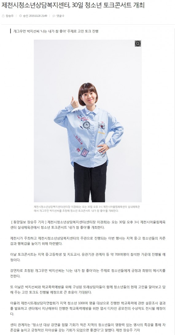 제천시청소년상담복지센터, 30일 청소년 토크콘서트 개최 페이지 정보 작성자 운영자 댓글 0건 조회 3,563회 작성일 19-10-31 15:02 본문 제천시청소년상담복지센터, 30일 청소년 토크콘서트 개최 목록 이전글제천시청소년상담복지센터, '그래피티 니팅' 진행 19.12.30 다음글제천시청소년상담복지센터, 청소년 토크콘서트 개최 19.10.31 댓글목록 댓글목록 등록된 댓글이 없습니다.