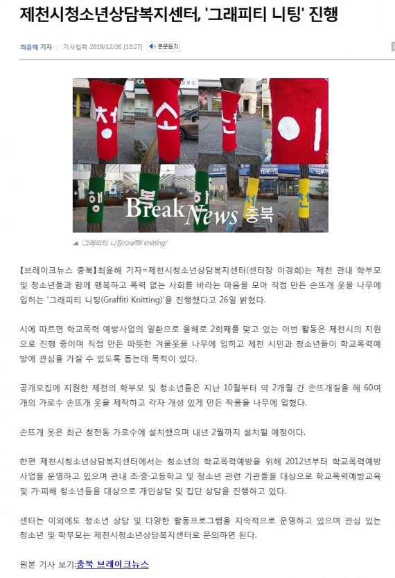 제천시청소년상담복지센터, '그래피티 니팅' 진행 페이지 정보 작성자 운영자 댓글 0건 조회 3,534회 작성일 19-12-30 14:59 본문 제천시청소년상담복지센터, '그래피티 니팅' 진행 목록 이전글제천시, 학부모와 청소년들 겨울나무에 손뜨개 옷 입히다 19.12.30 다음글제천시청소년상담복지센터, 30일 청소년 토크콘서트 개최 19.10.31 댓글목록 댓글목록 등록된 댓글이 없습니다.