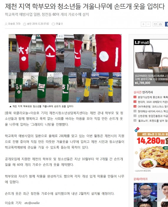 제천 지역 학부모와 청소년들 겨울나무에 손뜨개 옷을 입히다 페이지 정보 작성자 운영자 댓글 0건 조회 3,483회 작성일 19-12-30 14:59 본문 제천 지역 학부모와 청소년들 겨울나무에 손뜨개 옷을 입히다 목록 이전글'학교폭력 그만'...제천 학부모.학생, 겨울나무에 손뜨개 옷 입혀 19.12.30 다음글제천시, 학부모와 청소년들 겨울나무에 손뜨개 옷 입히다 19.12.30 댓글목록 댓글목록 등록된 댓글이 없습니다.