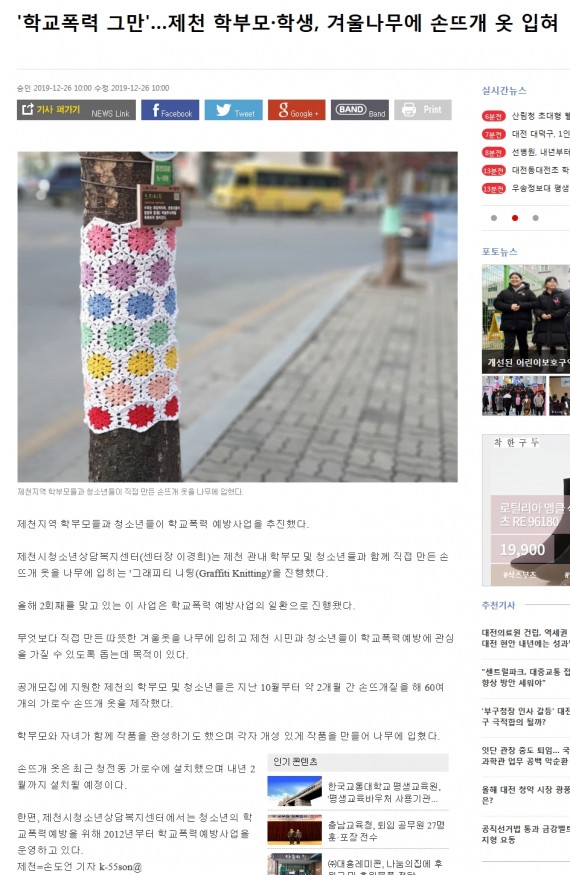 '학교폭력 그만'...제천 학부모.학생, 겨울나무에 손뜨개 옷 입혀 페이지 정보 작성자 운영자 댓글 0건 조회 3,422회 작성일 19-12-30 15:00 본문 '학교폭력 그만'...제천 학부모.학생, 겨울나무에 손뜨개 옷 입혀 목록 이전글제천 지역 학부모와 청소년들 겨울나무에 손뜨개 옷을 입히다 19.12.30 다음글제천 지역 학부모와 청소년들 겨울나무에 손뜨개 옷을 입히다 19.12.30 댓글목록 댓글목록 등록된 댓글이 없습니다.