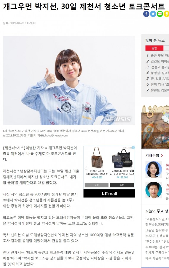 - 이전글"내가 참 좋아"... 개그우먼 박지선, 30일 제천 청소년들과 토크콘서트 19.10.31