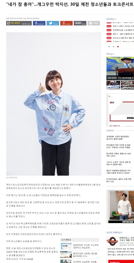"내가 참 좋아"... 개그우먼 박지선, 30일 제천 청소년들과 토크콘서트 페이지 정보 작성자 운영자 댓글 0건 조회 3,395회 작성일 19-10-31 14:53 본문 "내가 참 좋아"... 개그우먼 박지선, 30일 제천 청소년들과 토크콘서트 목록 이전글제천시청소년상담복지센터, 청소년 토크콘서트 30일 개최 19.10.31 다음글개그우먼 박지선, 30일 제천서 청소년 토크콘서트 19.10.31 댓글목록 댓글목록 등록된 댓글이 없습니다.