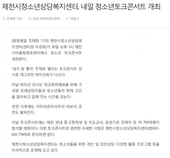 - 다음글제천시청소년상담복지센터, 30일 개그우먼 박지선과 함께하는 청소년 토크콘서트 개최 19.10.31
