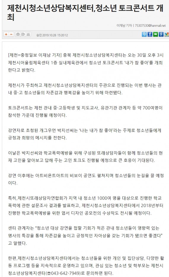 제천시청소년상담복지센터, 청소년 토크콘서트 개최 페이지 정보 작성자 운영자 댓글 0건 조회 3,501회 작성일 19-10-31 15:01 본문 제천시청소년상담복지센터, 청소년 토크콘서트 개최 목록 이전글제천시청소년상담복지센터 내일 토크콘서트 19.10.31 다음글제천시청소년상담복지센터, 박지선과 함께하는 청소년 토크콘서트 연다 19.10.31 댓글목록 댓글목록 등록된 댓글이 없습니다.
