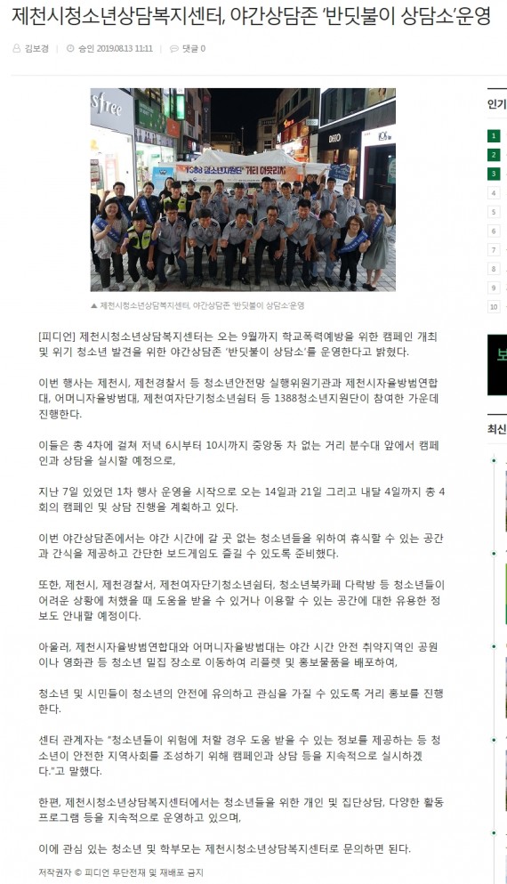 제천시청소년상담복지센터, 야간상담존 '반딧불이 상담소' 운영 페이지 정보 작성자 운영자 댓글 0건 조회 3,516회 작성일 19-09-04 11:42 본문 제천시청소년상담복지센터, 야간상담존 '반딧불이 상담소' 운영 목록 이전글제천시청소년상담복지센터 반딧불이 상담소 운영 19.09.04 다음글제천시청소년상담복지센터, 청소년 '반딧불이 상담소' 운영 19.09.04 댓글목록 댓글목록 등록된 댓글이 없습니다.