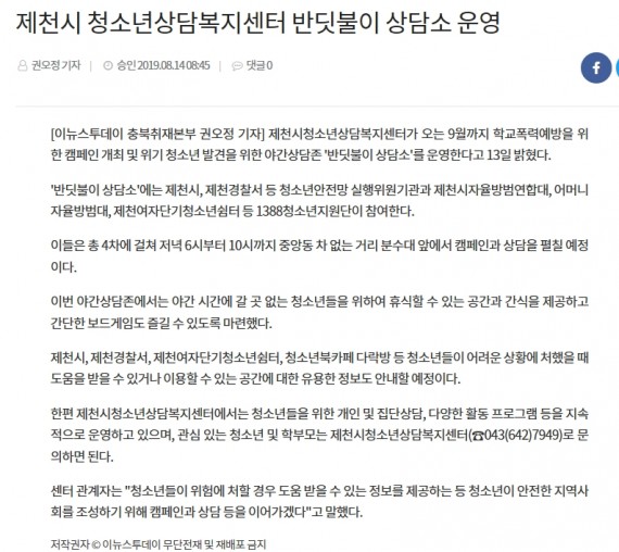 제천시청소년상담복지센터 반딧불이 상담소 운영 페이지 정보 작성자 운영자 댓글 0건 조회 3,542회 작성일 19-09-04 11:42 본문 제천시청소년상담복지센터 반딧불이 상담소 운영 목록 이전글제천시청소년상담복지센터, 야간상담존 '반딧불이 상담소' 19.09.04 다음글제천시청소년상담복지센터, 야간상담존 '반딧불이 상담소' 운영 19.09.04 댓글목록 댓글목록 등록된 댓글이 없습니다.