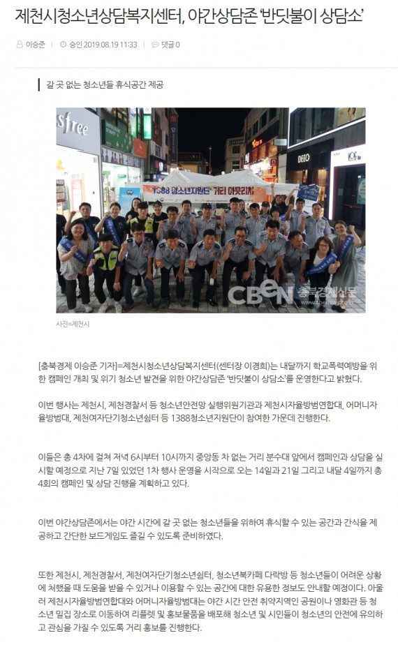 제천시청소년상담복지센터, 야간상담존 '반딧불이 상담소' 페이지 정보 작성자 운영자 댓글 0건 조회 3,559회 작성일 19-09-04 11:42 본문 제천시청소년상담복지센터, 야간상담존 '반딧불이 상담소' 목록 이전글제천청소년상담복지센터, 야간상담존 '반딧불이 상담소'운영 19.09.04 다음글제천시청소년상담복지센터 반딧불이 상담소 운영 19.09.04 댓글목록 댓글목록 등록된 댓글이 없습니다.