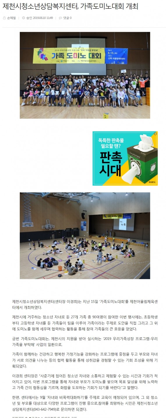 제천시청소년상담복지센터, 가족도미노대회 개최 페이지 정보 작성자 운영자 댓글 0건 조회 3,777회 작성일 19-09-04 11:44 본문 제천시청소년상담복지센터, 가족도미노대회 개최 목록 이전글제천시청소년상담복지센터, 부모대상 성교육 특강 실시 19.10.04 다음글제천청소년상담복지센터, 야간상담존 '반딧불이 상담소'운영 19.09.04 댓글목록 댓글목록 등록된 댓글이 없습니다.