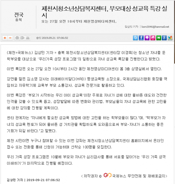 제천시청소년상담복지센터, 부모대상 성교육 특강 실시 페이지 정보 작성자 운영자 댓글 0건 조회 3,605회 작성일 19-10-04 14:24 본문 제천시청소년상담복지센터, 부모대상 성교육 특강 실시 목록 이전글제천청소년상담복지센터, 부모대상 성교육 특강 실시 19.10.04 다음글제천시청소년상담복지센터, 가족도미노대회 개최 19.09.04 댓글목록 댓글목록 등록된 댓글이 없습니다.