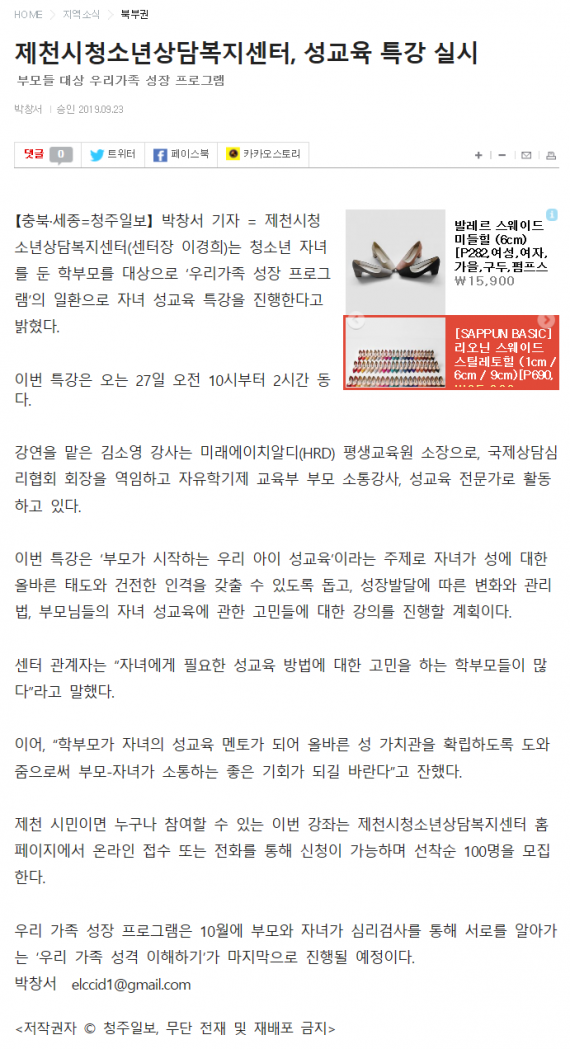 제천시청소년상담복지센터, 성교육 특강 실시 페이지 정보 작성자 운영자 댓글 0건 조회 3,671회 작성일 19-10-04 14:29 본문 제천시청소년상담복지센터, 성교육 특강 실시 목록 이전글제천청소년상담복지센터 27일 청소년 부모 성교육 19.10.04 다음글제천청소년상담복지센터, 부모대상 성교육 특강 실시 19.10.04 댓글목록 댓글목록 등록된 댓글이 없습니다.