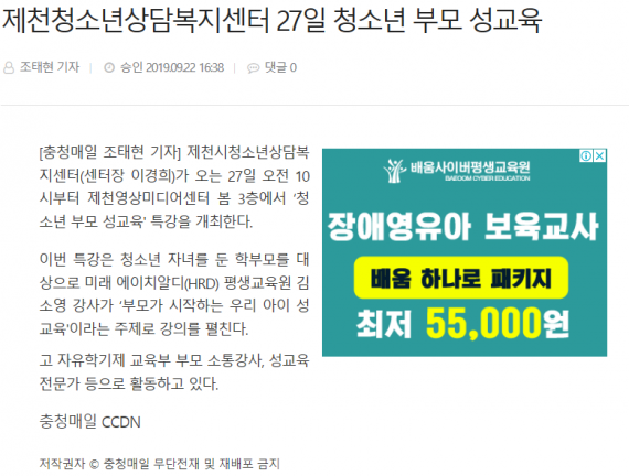 제천청소년상담복지센터 27일 청소년 부모 성교육 페이지 정보 작성자 운영자 댓글 0건 조회 3,721회 작성일 19-10-04 14:30 본문 제천청소년상담복지센터 27일 청소년 부모 성교육 목록 이전글제천시 청소년 상담센터, 청소년 부모 성교육 특강 마련 19.10.04 다음글제천시청소년상담복지센터, 성교육 특강 실시 19.10.04 댓글목록 댓글목록 등록된 댓글이 없습니다.