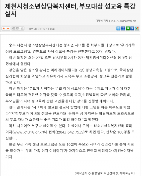 제천시청소년상담복지센터, 부모대상 성교육 특강 실시 페이지 정보 작성자 운영자 댓글 0건 조회 3,813회 작성일 19-10-04 14:31 본문 제천시청소년상담복지센터, 부모대상 성교육 특강 실시 목록 이전글제천시청소년상담복지센터, 청소년 토크콘서트 '내가 참 좋아' 개최 19.10.31 다음글제천시 청소년 상담센터, 청소년 부모 성교육 특강 마련 19.10.04 댓글목록 댓글목록 등록된 댓글이 없습니다.