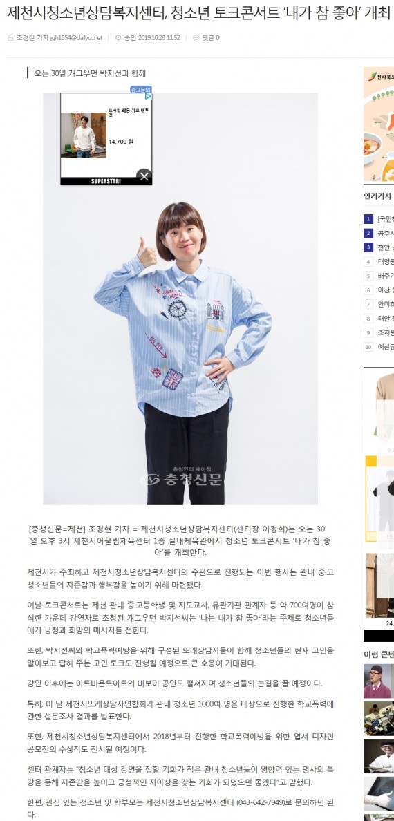 제천시청소년상담복지센터, 청소년 토크콘서트 '내가 참 좋아' 개최 페이지 정보 작성자 운영자 댓글 0건 조회 3,616회 작성일 19-10-31 14:51 본문 제천시청소년상담복지센터, 청소년 토크콘서트 '내가 참 좋아' 개최 목록 이전글개그우먼 박지선, 30일 제천서 청소년 토크콘서트 19.10.31 다음글제천시청소년상담복지센터, 부모대상 성교육 특강 실시 19.10.04 댓글목록 댓글목록 등록된 댓글이 없습니다.