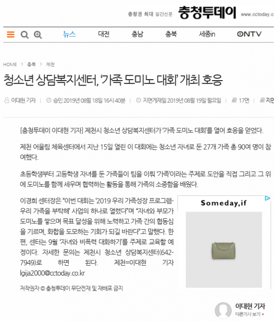제천시청소년상담복지센터, '가족도미노대회' 개최 호응 페이지 정보 작성자 운영자 댓글 0건 조회 3,380회 작성일 19-08-27 14:08 본문 제천시청소년상담복지센터, '가족도미노대회' 개최 호응 목록 이전글제천시청소년상담복지센터, 가족도미노대회 개최 19.08.27 다음글제천시청소년상담복지센터 가족도미노대회 개최 '호응' 19.08.27 댓글목록 댓글목록 등록된 댓글이 없습니다.