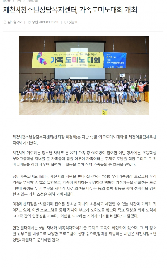 제천시청소년상담복지센터, 가족도미노대회 개최 페이지 정보 작성자 운영자 댓글 0건 조회 3,390회 작성일 19-08-27 14:09 본문 제천시청소년상담복지센터, 가족도미노대회 개최 목록 이전글제천시청소년상담복지센터 반딧불이 상담소 운영 19.09.04 다음글제천시청소년상담복지센터, '가족도미노대회' 개최 호응 19.08.27 댓글목록 댓글목록 등록된 댓글이 없습니다.