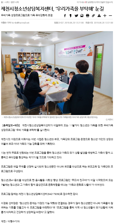 제천시청소년상담복지센터, '우리가족을 부탁해'눈길 페이지 정보 작성자 운영자 댓글 0건 조회 3,393회 작성일 19-06-27 09:36 본문 . 목록 이전글제천시 청소년복지센터, 우리 가족 성장 프로그램 운영 19.06.27 다음글제천시청소년상담복지센터, 우리가족 성장프로그램 '우리가족을 부탁해'실시 19.06.27 댓글목록 댓글목록 등록된 댓글이 없습니다.