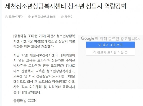 제천시청소년상담복지센터 청소년 상담자 역량강화 페이지 정보 작성자 운영자 댓글 0건 조회 3,495회 작성일 19-07-29 13:43 본문 제천시청소년상담복지센터 청소년 상담자 역량강화 목록 이전글제천시청소년상담복지센터, 심리적 외상개입 전문가 양성교육 19.07.29 다음글제천시청소년상담복지센터 11월까지 가족 프로그램 진행 19.06.27 댓글목록 댓글목록 등록된 댓글이 없습니다.