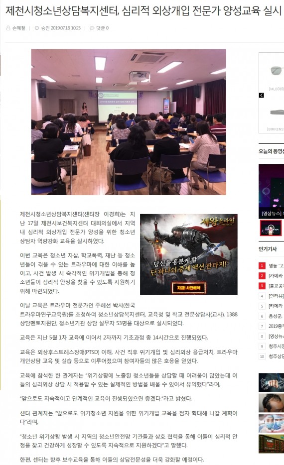 제천시청소년상담복지센터, 심리적 외상개입 전문가 양성교육 실시 페이지 정보 작성자 운영자 댓글 0건 조회 3,396회 작성일 19-07-29 13:44 본문 제천시청소년상담복지센터, 심리적 외상개입 전문가 양성교육 실시 목록 이전글제천시청소년상담복지센터, 심리적 외상개입 전문가 양성교육 실시 19.07.29 다음글제천시청소년상담복지센터, 심리적 외상개입 전문가 양성교육 19.07.29 댓글목록 댓글목록 등록된 댓글이 없습니다.