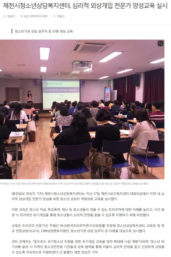 제천시청소년상담복지센터, 심리적 외상개입 전문가 양성교육 실시 페이지 정보 작성자 운영자 댓글 0건 조회 3,548회 작성일 19-07-29 13:44 본문 제천시청소년상담복지센터, 심리적 외상개입 전문가 양성교육 실시 목록 이전글제천시청소년상담복지센터, 심리적 외상개입 전문가 양성교육 실시 19.07.29 다음글제천시청소년상담복지센터, 심리적 외상개입 전문가 양성교육 실시 19.07.29 댓글목록 댓글목록 등록된 댓글이 없습니다.