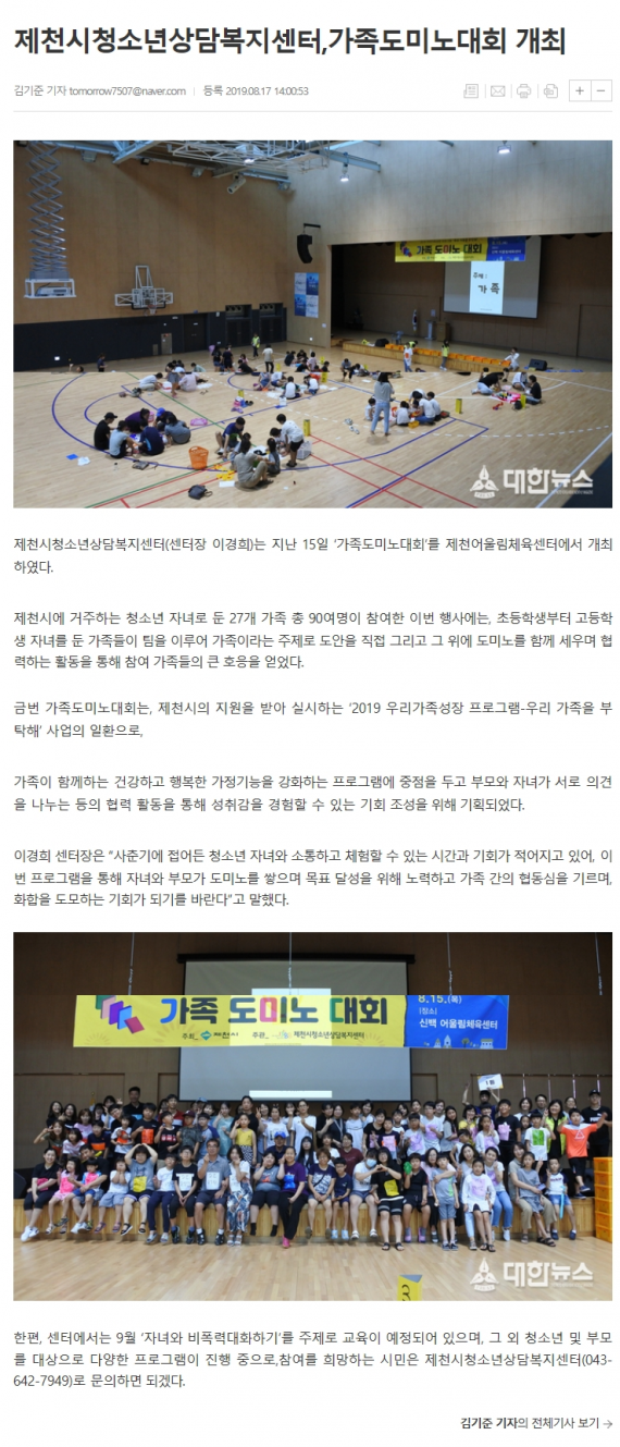 제천시청소년상담복지센터, 가족도미노대회 개최 페이지 정보 작성자 운영자 댓글 0건 조회 3,544회 작성일 19-08-27 14:04 본문 제천시청소년상담복지센터, 가족도미노대회 개최 목록 이전글제천시청소년상담복지센터, 가족도미노대회 개최 19.08.27 다음글제천시, 가족도미노대회 개최 19.08.27 댓글목록 댓글목록 등록된 댓글이 없습니다.