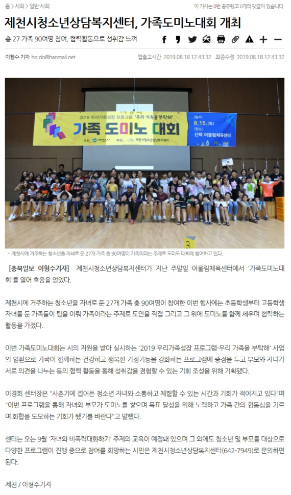 제천시청소년상담복지센터, 가족도미노대회 개최 페이지 정보 작성자 운영자 댓글 0건 조회 3,331회 작성일 19-08-27 14:07 본문 제천시청소년상담복지센터, 가족도미노대회 개최 목록 이전글제천시청소년상담복지센터, 가족도미노대회 개최 19.08.27 다음글제천시청소년상담복지센터, '가족도미노대회' 개최 19.08.27 댓글목록 댓글목록 등록된 댓글이 없습니다.