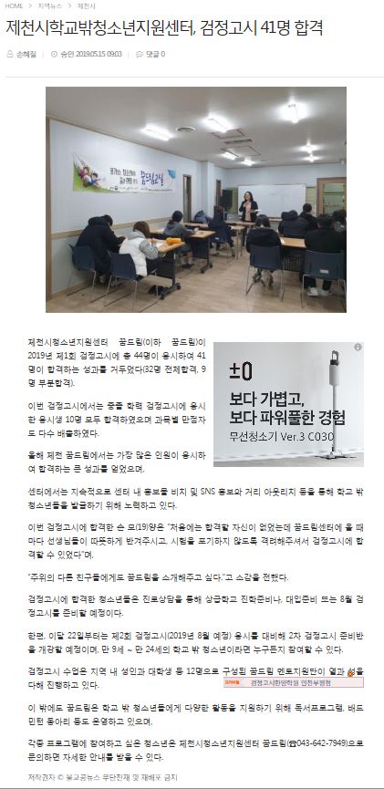제천시학교밖청소년지원센터, 검정고시 41명 합격 페이지 정보 작성자 운영자 댓글 0건 조회 3,333회 작성일 19-05-15 17:41 본문 . 목록 이전글제천시학교밖청소년지원센터, 검정고시 41명 합격 19.05.15 다음글제천청소년상담센터, 'SKY 캐슬-숨겨진 이야기'특강 마련 19.04.23 댓글목록 댓글목록 등록된 댓글이 없습니다.