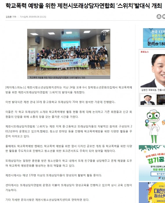 학교폭력 예방을 위한 제천시또래상담자연합회 '스위치' 발대식 개최 페이지 정보 작성자 운영자 댓글 0건 조회 3,463회 작성일 19-06-03 10:15 본문 학교폭력 예방을 위한 제천시또래상담자연합회 '스위치' 발대식 개최 목록 이전글학교폭력 예방을 위한 제천시또래상담자연합회 '스위치' 발대식 개최 19.06.03 다음글제천시또래상담자연합회 '스위치' 발대식 개최 19.06.03 댓글목록 댓글목록 등록된 댓글이 없습니다.