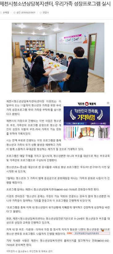 제천시청소년상담복지센터, 우리가족 성장프로그램 실시 페이지 정보 작성자 운영자 댓글 0건 조회 3,409회 작성일 19-06-27 09:35 본문 . 목록 이전글제천시청소년상담복지센터, 우리가족 성장프로그램 '우리가족을 부탁해'실시 19.06.27 다음글제천시청소년상담복지센터, '우리가족 부탁해'실시 19.06.27 댓글목록 댓글목록 등록된 댓글이 없습니다.