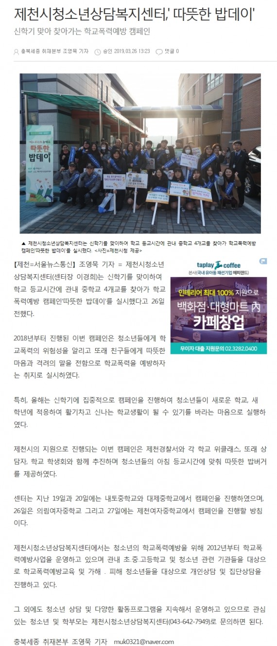 제천시청소년상담복지센터, '따뜻한 밥데이' 페이지 정보 작성자 운영자 댓글 0건 조회 3,514회 작성일 19-04-12 11:52 본문 제천시청소년상담복지센터, '따뜻한 밥데이' 목록 이전글제천시청소년상담복지센터, 따뜻한 밥데이 실시 19.04.12 다음글제천 청소년센터 '따뜻한 밥 데이' 운영 19.04.12 댓글목록 댓글목록 등록된 댓글이 없습니다.