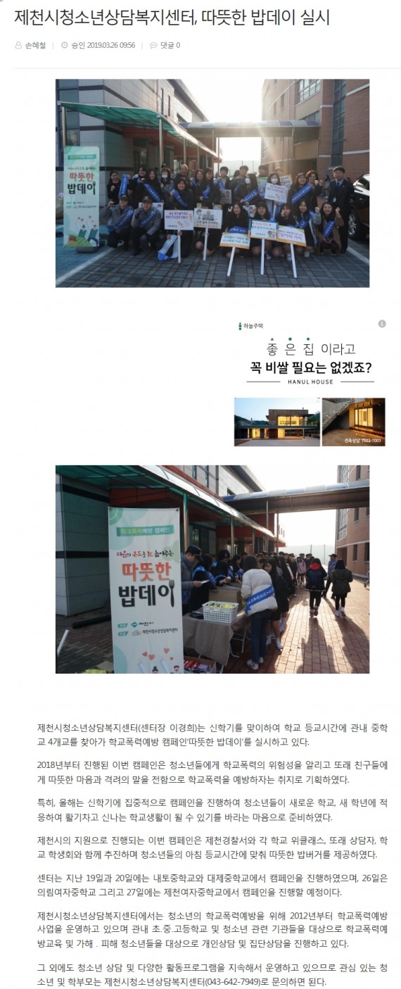 제천시청소년상담복지센터, 따뜻한 밥데이 실시 페이지 정보 작성자 운영자 댓글 0건 조회 3,548회 작성일 19-04-02 16:14 본문 제천시청소년상담복지센터, 따뜻한 밥데이 실시 목록 이전글제천시청소년상담복지센터, 학교폭력예방 캠페인 '따뜻한 밥데이' 실시 19.04.02 다음글제천시청소년상담복지센터, 신학기 대비 프로그램 운영 19.03.15 댓글목록 댓글목록 등록된 댓글이 없습니다.