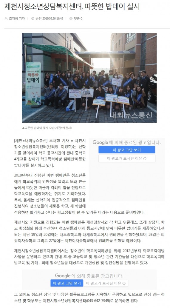 제천시청소년상담복지센터, 따뜻한 밥데이 실시 페이지 정보 작성자 운영자 댓글 0건 조회 3,466회 작성일 19-04-02 16:16 본문 제천시청소년상담복지센터, 따뜻한 밥데이 실시 목록 이전글제천시청소년상담복지센터 따뜻한 밥데이 실시 19.04.02 다음글제천시청소년상담복지센터, 학교폭력예방 캠페인 '따뜻한 밥데이' 실시 19.04.02 댓글목록 댓글목록 등록된 댓글이 없습니다.