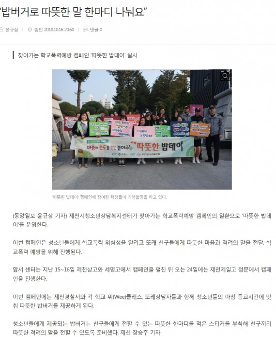 제천시청소년상담복지센터 찾아가는 학교폭력예방 캠페인 '따뜻한 밥데이' 실시