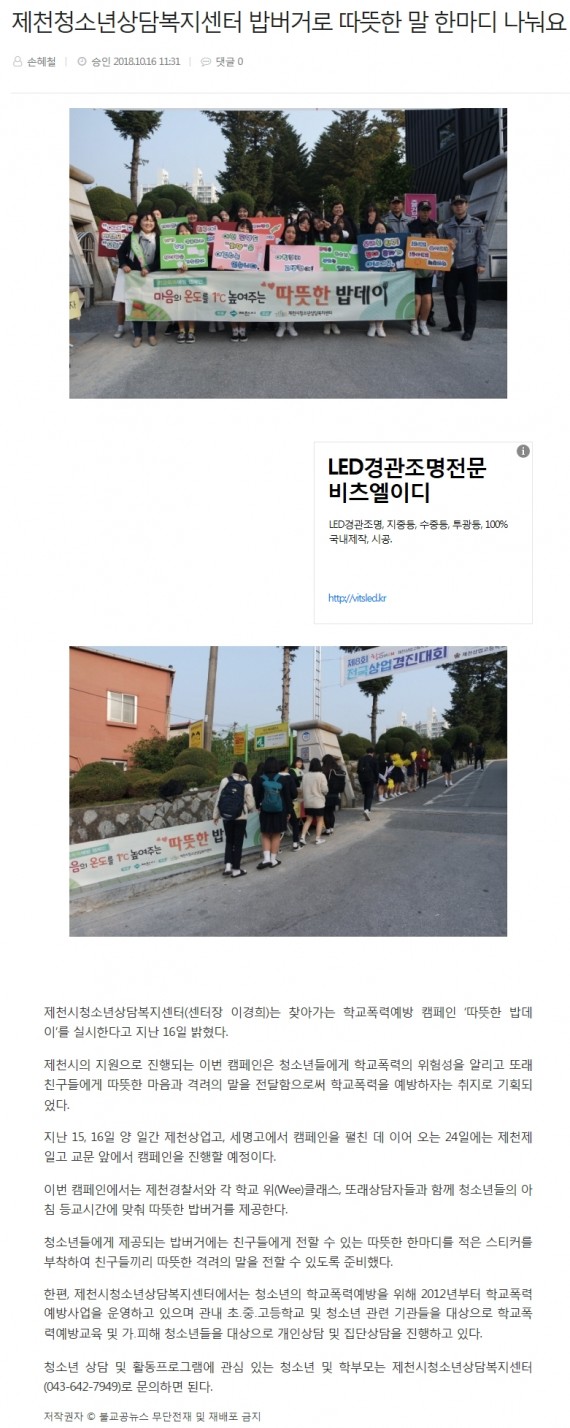 제천시청소년상담복지센터 찾아가는 학교폭력예방 캠페인 '따뜻한 밥데이' 실시
