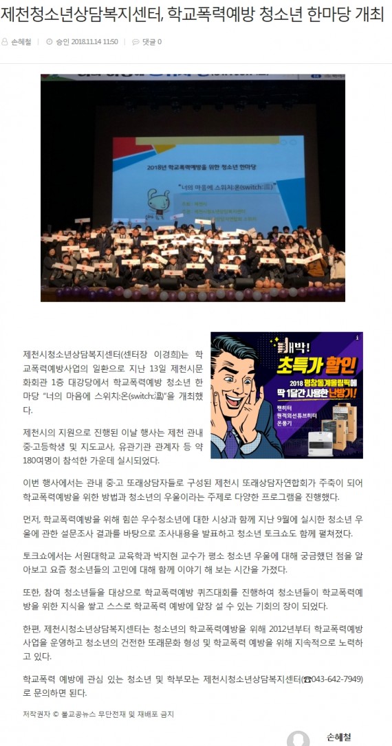 제천청소년상담복지센터, 학교폭력예방 청소년 한마당 개최 페이지 정보 작성자 운영자 댓글 0건 조회 3,635회 작성일 18-11-25 18:26 본문 제천청소년상담복지센터, 학교폭력예방 청소년 한마당 개최 목록 이전글제천시청소년상담복지센터, 학교폭력예방 청소년 한마당 개최 18.11.25 다음글2018년 제천시 학교폭력대책지역협의회 개최 18.11.25 댓글목록 댓글목록 등록된 댓글이 없습니다.