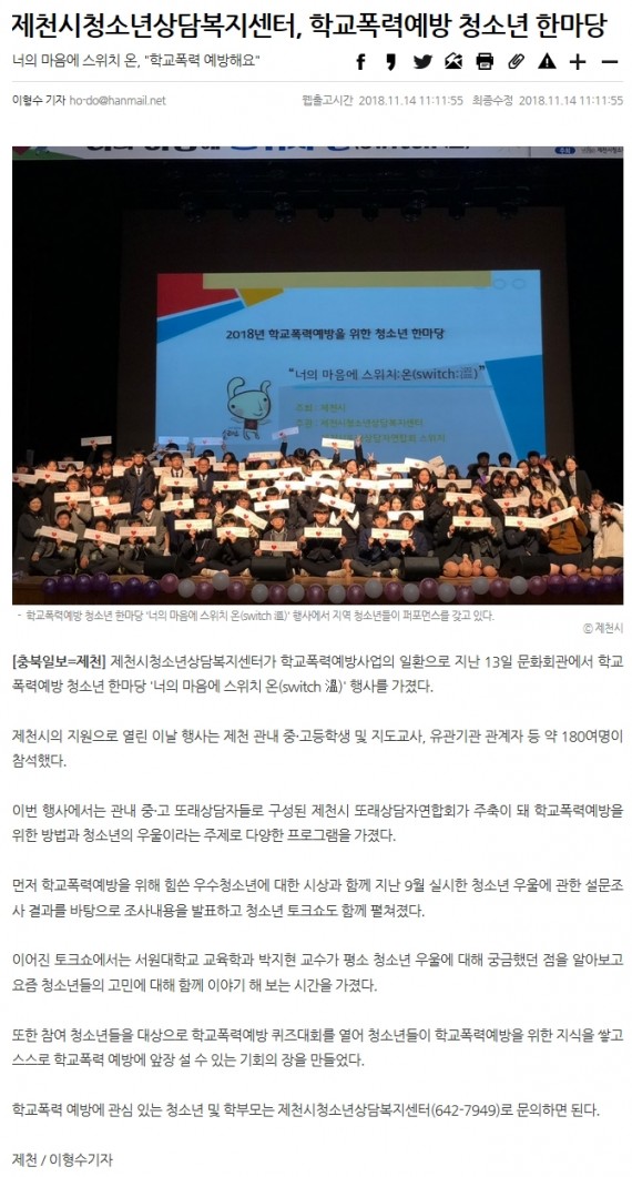 제천시청소년상담복지센터, 학교폭력예방 청소년 한마당 페이지 정보 작성자 운영자 댓글 0건 조회 3,766회 작성일 18-11-25 18:27 본문 제천시청소년상담복지센터, 학교폭력예방 청소년 한마당 목록 이전글제천시청소년상담복지센터, 지난 13일 학교폭력예방 청소년 한마당 개최 18.11.25 다음글제천시청소년상담복지센터, 학교폭력예방 청소년 한마당 개최 18.11.25 댓글목록 댓글목록 등록된 댓글이 없습니다.