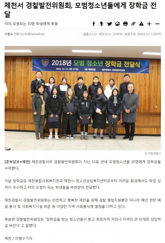 제천서 경찰발전위원회, 모범청소년들에게 장학금 전달
