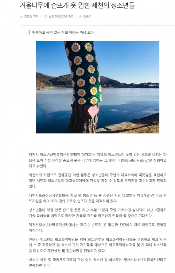 겨울나무에 손뜨개 옷 입힌 제천의 청소년들 페이지 정보 작성자 운영자 댓글 0건 조회 3,610회 작성일 18-12-31 16:39 본문 겨울나무에 손뜨개 옷 입힌 제천의 청소년들 목록 이전글제천의 청소년들, 겨울나무에 손뜨개 옷 입혀 18.12.31 다음글제천시청소년상담복지센터, CYS-Net사업 운영보고대회 및 꿈드림 졸업식 개최 18.12.31 댓글목록 댓글목록 등록된 댓글이 없습니다.