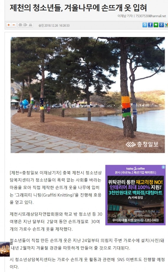 제천의 청소년들, 겨울나무에 손뜨개 옷 입혀 페이지 정보 작성자 운영자 댓글 0건 조회 3,607회 작성일 18-12-31 16:39 본문 제천의 청소년들, 겨울나무에 손뜨개 옷 입혀 목록 이전글제천청소년들, 겨울나무에 손뜨개 옷 입혀 18.12.31 다음글겨울나무에 손뜨개 옷 입힌 제천의 청소년들 18.12.31 댓글목록 댓글목록 등록된 댓글이 없습니다.